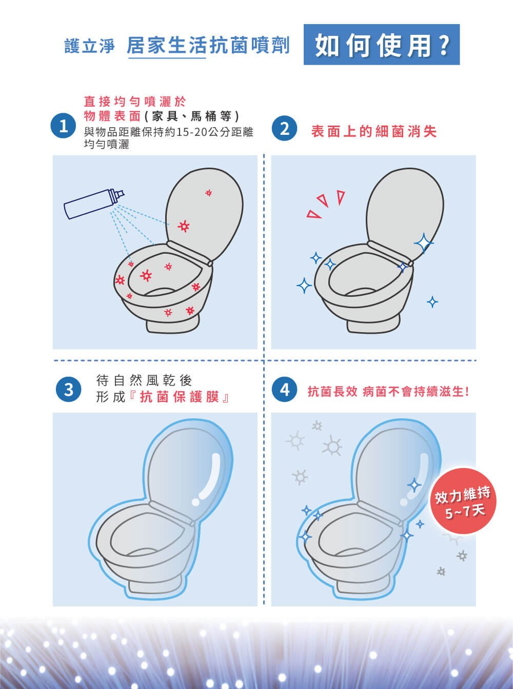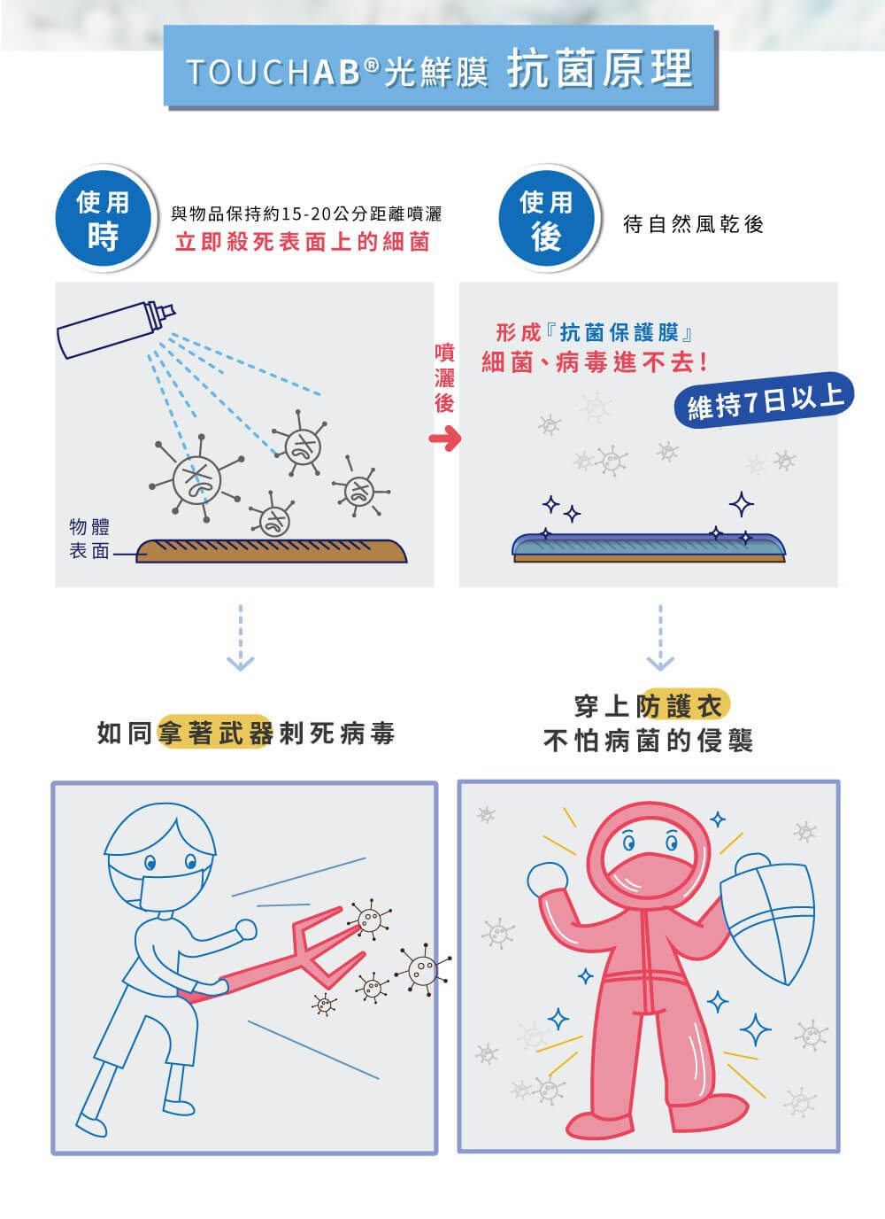 ◆ 待自然風乾後,形成抗菌保護膜,效力持續5-7天。