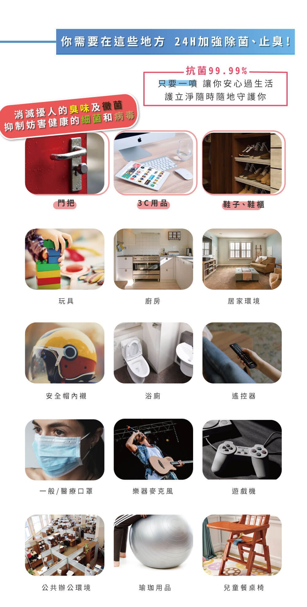 ◆ 可噴灑於桌面,把手,電梯按鈕、3C產品表面(非光學等級表面,如:鍵盤、滑鼠、電話話筒、各類按鍵、機殼…等)、櫥櫃、垃圾桶、 洗水槽、瀝水盤、排水管口、廚餘、鞋櫃、磁磚縫隙(可預防發霉,但使用方式需噴灑完待乾燥才能用濕)