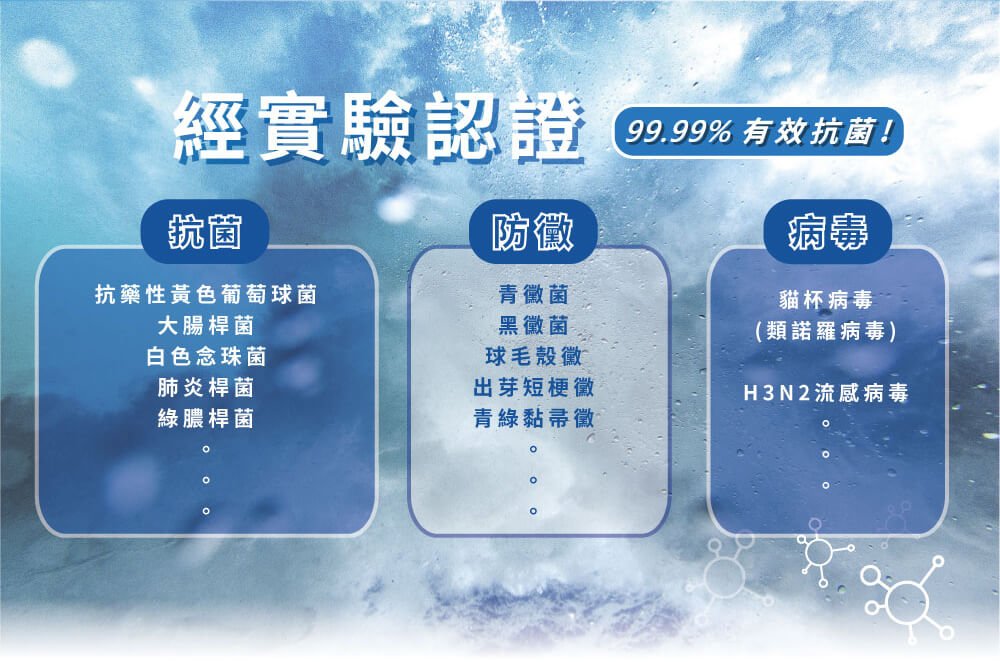 ◆ 特殊覆膜科技,不易脫落,能持續抗菌防黴5-7日以上,且不會造成細菌抗藥性。