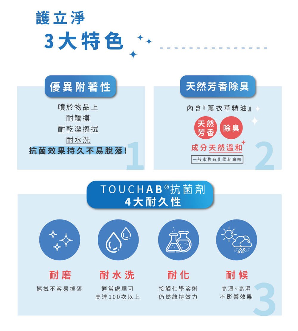 ◆ 採用全球專利被動式抗菌技術TouchAB®,能在多數物質表面上形成抗微生物防護膜。